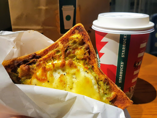As usual, the coffee was good and the chicken & egg pesto toast was delicious. It was just hard to bite at the sides because they had...