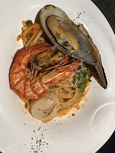 ❇️蕃茄海鮮義大利麵:包含二個淡菜、一隻大蝦及一個生干貝,海鮮很新鮮,尤其是干則非常嫩,用的是義大利寬麵,口感微硬有咬勁,口味偏鹹,蕃茄味比較淡一些,份量上比較精簡,也滿好吃的