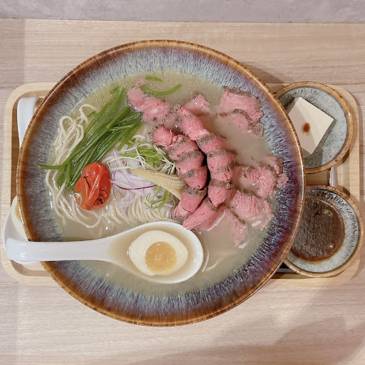 2022/10/04初訪⬇️ 甘醇牛白湯拉麵(1st ver.)$280+香草牛板腱$90 選配:麵硬度》適中、沾醬》青花椒麻醬,特殊需求》無 拉麵內含(附):紫洋蔥、時令蔬菜(水蓮)、青蔥、小番茄、玉米筍、香草板腱牛一份、溏心蛋半顆、腰果奶酪一份 店內座位僅有7席,但各自的空間很大,可以很放鬆、舒服的吃麵,老闆一人包辦店內外所有事務,卻不忘帶著笑容與熱情迎接每一位客人,非常喜愛這樣的氛圍。 自助冰水含有水果,聽說是老闆每天去市場買的,喝起來更清爽,飯前來一口很開胃。 選好湯頭口味後,老闆會先給一小杯熱湯試喝,詢問鹹度是否需要調整(老闆還貼心小提醒,加麵後鹹度會再淡個1至2成),確認好之後不久,麵就上桌了。 湯頭一入口,先是中藥材的香味,牛的味道緊跟在後,既清甜亦醇厚,從初嚐的馥郁到尾韻的甘洌,都能感受到老闆的用心;麵條是直麵,搭配清甜型的白湯很順口,越“素”越起勁;牛肉叉燒是以美國板腱牛經12小時舒肥而成,上桌時約為3至5分熟,軟嫩且富含肉汁,可依喜好泡熱湯增加熟度,配上青花椒麻醬,有種在吃和牛火鍋的錯覺,怎麼可以這麼搭,一片接一片停不下來,麻和辣都在安全範圍之內,我覺得不吃辣的人也一定要嘗試看看,加點板腱牛$90的價格完全可以;碗內其他配料也都很棒,尤其是老闆有添加一樣食材叫「脆藻」增添口感,特別驚艷,整碗吃完覺得搭配非常好,沒有一樣食材是多餘的,無可挑惕;飯後甜點腰果奶酪更是令人印象深刻,口感極其綿密,濃濃的腰果香補足了缺少的甜度,一樣能帶來極大的滿足感。 從店面到拉麵,處處可見老闆的巧思,附贈的甜點讓這一餐有了儀式感,老闆親切的閒聊,讓走出店門口的我,覺得暖的不只是胃,還有我的心,這麼棒的店,一定要回訪