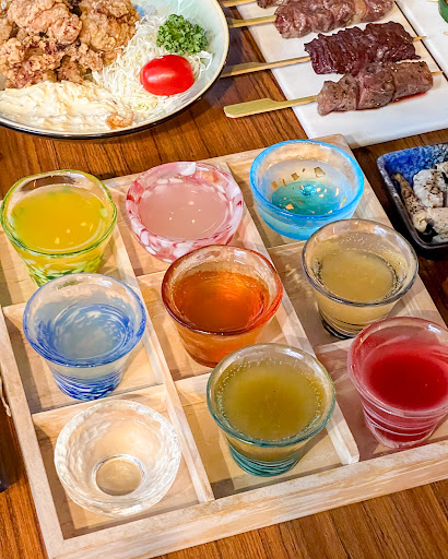 我們當天喝到的清酒有白鶴跟金陵的都很甘甜好喝~ 果實酒有哈密瓜、柳橙、柚子、水蜜桃、草莓、青梅 有些是有果肉的有些沒有 喝起來酒味都不重 酒量不好也可以喝 朋友覺得柳橙的比較好喝 我個人喜歡水蜜桃的🥰 最中間是梅酒...