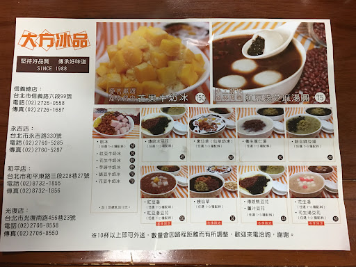 Read moreAlways a devout experience enjoying their amazingly delicious douhua with a sweet liquidsauce with three extra condiments. I am sure that their mango ice is fantastic but at about 130nt, is it really worth it? It certainly can't compete with the excellent choice of mango or multiple fruit icexserved at the not to distant Raohe night market. Having said that, it is still probably the best and most importantly popular desert barman the area and you won't get a parking ticket if you leave your SCOOTER outside. Has eat in or take away options from the menus. In all, highly...