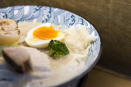 配料有淺漬過的生食級干貝,炙燒後微香,干貝肉飽水軟嫩,鮮甜不腥。柚子鹽味雞貝餛飩,內餡帶有雞軟骨跟干貝,口感有趣,叉燒有舒肥雞胸肉片跟炙燒雞腿捲兩種,加上高麗菜、炙燒青花菜、半顆溏心蛋,這些配料可以轉味用,不會讓干貝湯一直喝而膩感,其中溏心蛋用柚子提味非常清爽,蛋黃熟度適中,我非常喜歡,可惜不能加點。