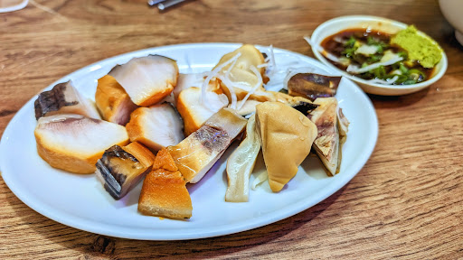 Read more一家出乎意料好吃的鯊魚庵店。 鯊魚庵有煙燻的味道但不會太嗆或太濃,然後魚肉沒有濃濃的氨味。 綜合的可以吃到各種不同的部位,其中魚皮非常Q彈,魚腹肉超級軟嫩。搭配蒜泥醬油膏會更好吃。 另外,排骨酥湯的湯給的很夠喝,味道也很好,不會太淡或水水的。排骨是用軟骨家附近的肉,所以肉質很軟,搭配軟骨脆脆的,也很好吃。 連不愛吃鯊魚庵的人都覺得很不錯,是會回訪的一家店。下次想試看看鯊魚眼。 It is a surprising and delicious shark meat shop. The shark meat has a smoky flavor but is not too choking or rich, without the strong ammonia smell. The mixed dish allows you to enjoy different portions of shark meat. The shark shin is elastic, and the shark belly is super soft. All of them are suitable for the garlic soy sauce paste, which elevates them to the next level. In addition, the soup of deep-fried rib is also great, without being light or watery. Due to the cartilages with meat being used, the texture is soft, accompanied by a crispy element. Even for people who do not like the smell of shark meat, it still feels delicious. It is a worthwhile shop to visit again. Next time, I will try...