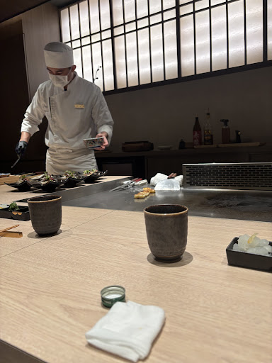 I recently dined at this Teppanyaki restaurant with a friend. The food quality was good—while not exceptional, it offered reasonable satisfaction, particularly with the discount applied. However, the service experience was mixed. The meal was served at an unusually fast pace, with new dishes arriving before we could finish the previous ones, making it feel rushed and somewhat intrusive. We also had to request tea refills multiple times, although side dishes were promptly replenished when noticed. Interaction with the chef was minimal; while she explained each dish, her presentation came across as detached and lacked enthusiasm. Furthermore, we were frequently reminded of our finishing time, which left us with the impression that we were being rushed to leave.