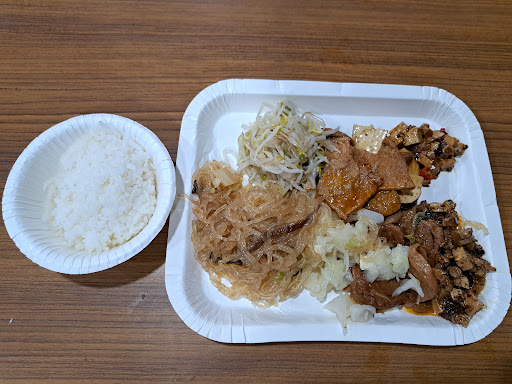付錢時老闆會問你是否需要白飯跟春捲,當時我有說要春捲(吃起來是從冰箱拿出來的,口感跟味道不錯但整個都是涼的),之後可以拿夾子去夾菜,有許多菜可以選擇,青菜、豆製品、蘿蔔糕還有炒麵、炒飯、麵類等等都有,咖哩或素肉臊皆有,但是!!!