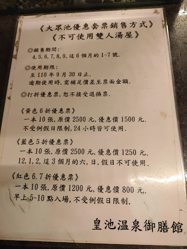 Read more很久沒在google地圖上留一顆星的評價了,是這樣的一時興起的年初四晚上跟女朋友到皇池三館泡湯,其實我們是已經用過晚餐再來泡湯的,所以我們只是純泡湯,過年當然算是假日時間泡湯30分鐘,這個部分我們是懂的,以前在一館管理員很會做生意的說人少我可以幫你加10分鐘,其實泡湯我也不會泡多久,這樣的說法真的很容易打動我, 或許現在擴大營業後人員管理上的服務方式與說詞也變了... 30分鐘就30分鐘吧!那就照規矩來吧!