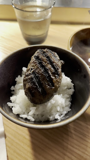 Very juicy wagyu patties (which you can watch get made while you eat) are first flame grilled to get some nice marks on it then finished on a lower heat; you're served 3 pieces over time, with a recommendation of how to try each piece written on a sheet tucked inside the drawer at your seat (along with utensils, a wet napkin, and fancy S&P grinders). The different sauces, spices and accompaniments do make it fun to explore different combinations even if not everything may be to your taste.