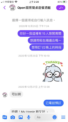 再補一筆一個禮拜前訂位的狀況,打電話訂位說很忙要我粉絲團私訊,結果讀訊息時已經是一天半後的事了,我是不知道你們有沒有忙到沒時間回覆訊息啦,不過對一個要訂15人包廂的顧客來說,感受是蠻差的(怕晚一天就被訂走),底下附上截圖給往後有意訂...