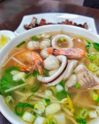 #清湯海鮮板條 裡的板條本人非常Q彈,湯頭也很鮮甜且不油膩,食材有鯛魚片🐟、白蝦🦐、透抽圈🦑、洋蔥🧅、豆芽、青蔥、小丸子等,份量十足。