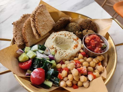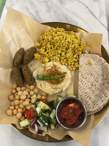 The concept is brilliant. A menu is tacked to the wall. You can choose between Arabic, Indian, or Mexican sets and the servers create your “thali-like” sets on beautiful brass trays.