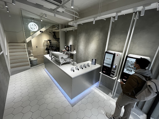 A hidden cafe between two busy streets with a simple, elegant, and clean interior. The aesthetic is a calming blend of white and grey. It is a nice quiet space to work by yourself or chat with a couple other friends. There is a clean little restroom in the back of the first floor away from the main area. The entire space of both floors are chilled and airconditioned. The window view overlooks a broad parking space with some buildings and trees. A good portion of the sky is within sight as well. The view is rather boring but would not leave one feeling claustrophobic. I would describe the music selection as a mix meditative and lofi.