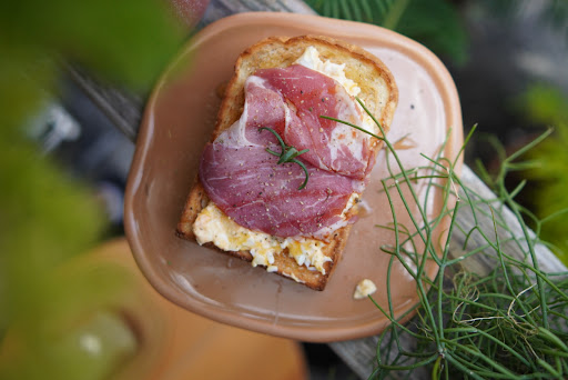 改點擺盤也是很美的青醬厚培根,所有餐點都是現點現做,所以稍微等了一下,送上來是一個厚切吐司,鋪上滿滿的起司、青醬也是很豪邁的擠,整個配色也很美,紅黃綠三種顏色都有 後切的土司烤過之後,外皮酥脆,內心柔軟,青醬味道很濃郁,還帶有一個特殊了香氣,我想了很久這個熟悉的香味是什麼,最後想起來是薄荷 這樣多層次的青醬可以解除培根還有起司吃多的膩感,整體味道的搭配也很平衡