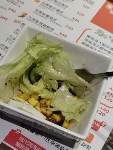 Salad: corn, lettuce, a slice of egg. Salad dressing can be selected. Either the standard thousand island sauce or the sour-ish (I think balsamic vinegar or cider, can't remember) very simple dish and nothing special.
