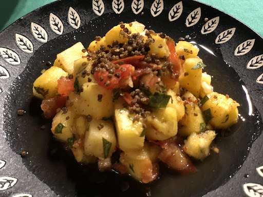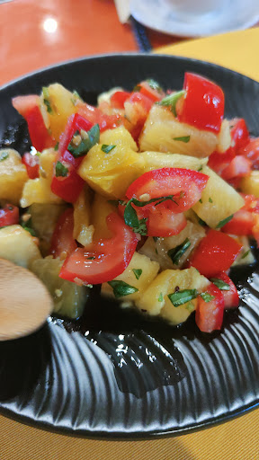 (6大呈現菜色如下) 前菜涼拌:蕃茄伴鳳梨... 不囉嗦就是想像得出的味道 薑黃糯米飯:經典蒸飯但是偏硬(我以為至少可以放點紅藜或是小米襯托出特色?) 鹽烤吳郭魚:這道菜可圈可點,烤工一流香嫩多汁,魚本身完全沒有腥羶 炸南瓜:不知道算甜點還是只是中場過嘴,但在第三道出現 炒雨來菇:我以為是屏東名產? 炒半天筍:調味完美的一道菜,甘蔗心本身也嫩到不行 碳烤豬肋排:BBQ醬偏甜,costco? 但是不柴也算可拆 炒野菜:台東常見黑甜菜,很嫩,但少放了小魚乾等提味有點可惜 綜合海鮮:這道算失敗......