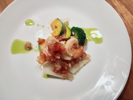 先講餐點幾個大問題: 第二道海鮮沙拉的軟絲(?)過熟、過鹹的柚子醬只剩滿滿的胡椒味,完全無法襯托海鮮的清甜。 第三道以鮮蝦為主體(搭自製青醬、酪梨、番茄和柚子)的前菜:兩隻蝦都煮過熟,肉老不好吃。 第四道燉飯完全沒有米心,飯的味道也不好吃,只有上面的配料還不錯。 第一道(濃湯)和最後的甜點(蛋糕+冰淇淋)都是中規中矩,不難吃也不好吃,大概五六百元連鎖西餐的表現。