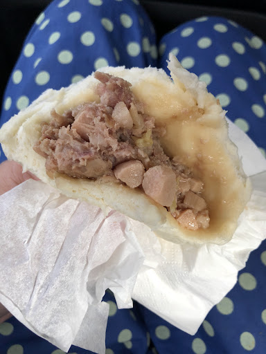 Read more路過看到很多人在排隊。就下來跟著湊熱鬧 。他的那隻寫著(不用排隊請抽號碼牌)的標籤🏷️藏放在裡面。應該要拿出來放在外面明顯的地方才不會讓初次探訪的食客莫名。 我算聰明。就大聲問著: 請問怎麼排隊? 熱情的台灣人就會跟你說怎麼做。 後來有一對姐妹花就憨憨的在排隊,排在在櫃檯結賬的後面。結果等到她們要過去時才被提醒要抽號碼牌😄 白白多等了。 生意很好 看到很個人都打包小包的 我只是要嚐鮮的人就覺得有點不好意思。不知道會不會被當作是來亂的。 沒辦法👐,因為剛剛吃完午餐。晚餐飯店又有罷飛在等著… 吃一顆嚐鮮。好吃😋的話,回程在來採購。 等了10個號碼後。買一顆筍丁肉包開鮮。 車上分食。 好大一顆才$25元很物超所值。 面皮很白,不知道是否有買到漂白過的麵粉。面皮口感很紮實有嚼勁,風味很像鹿港阿振肉包感;餡料油控的非常到位整體吃起來沒有油潤濕滑感,很清爽。像極了在吃一顆超級大顆的小籠包。 算有特色跟好吃。 但是吃完後,尾韻的口腔內很有乾澀感。不...