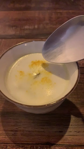 絲瓜蛤蜊濃湯,上方有初鹿牛奶打出泡沫薄薄的在最上層上方撒上一點自製的薑粉,中間放一點魚子醬,沒有加任何的調味,是本身食材的味道 很喜歡這道,不確定是不是因為上面那層奶的關係,所以混合後有濃湯的感覺,還是本身已經是濃湯,上面的奶只是增加厚度 而應該是因為有上面那層的關係,湯的溫度保存的很好(差點燙死,可是喜歡燙死)蛤蜊大顆有很鮮,魚子醬本身吃鹹,但加在裡面一點點的剛剛好