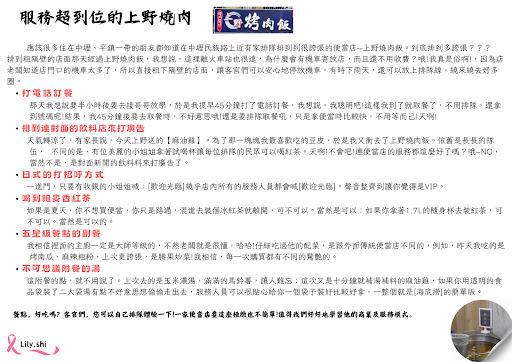 服務超到位的上野燒肉 應該很多住在中壢,平鎮一帶的居民都知道在中壢浸信會附近有家排隊排到到很誇張的便當店--上野燒肉飯。到底排到多誇張??? 排到租隔壁的店面 那天經過上野燒肉飯,我想說,這裡離火車站也很遠,為什麼會有機車寄放店,而且還不用收費?哦!我真是俗啊!,因為店老闆知道店門口的機車太多了,所以直接租下隔壁的店面,讓客官們可以安心地停放機車,有時下雨天,還可以放上排隊線,繞來繞去好多圈 打電話訂餐 那天我想說要半小時後要去接哥哥放學,於是我提早45分鐘打了電話訂餐,我想說,我聰明吧!這樣我到了就取餐了,不用排隊,還拿到號碼呢!結果,我45分鐘後要去取餐時,不好意思哦!還是要排隊取餐吼,只是拿便當時比較快,不用等而己!天啊! 排到連對面的飲料店來打廣告 天氣轉涼了,有家長說,今天上野送的【麻油雞】。為了那一塊塊我最喜歡吃的豆皮,於是我又衝去了上野燒肉飯。依舊是長長的隊伍,不同的是,有位美麗的小姐姐拿著試喝杯讓每位排隊的民眾可以喝紅茶。天啊!不會吧!連便當店的服務都這麼好了嗎?哦~NO,當然不是,是對面新開的飲料料來打廣告了。 那餐點呢?我們先來看一下服務吧! 日式的招呼方式 我很詫異一家燒肉店,即是日式的服務,只要有收銀的小姐姐喊:[歡迎光臨]幾乎店內所有的服務人員都會喊[歡迎光臨]。聲音整齊到讓你覺得是VIP。 麥香紅茶 如果是夏天,你不想買便當,你只是路過,混進去裝個冰紅茶就離開,可不可以。當然是可以;如果你拿著1.7L的隨身杯去裝紅茶,可不可以。當然是可以的。 附餐的湯 這附餐的點,就不用說了。上次去的是玉米濃湯,滿滿的馬鈴薯,讓人難忘;這次又是十分鐘就補湯補料的麻油雞,如果你用透明的食品袋裝了二大袋湯有點不好意思想偷偷走出去,服務人員可以很貼心給你一個袋子裝好比較好拿,一整個就是[海底撈]的簡單版。 餐點,好吃嗎?客官們,您可以自己排隊體驗一下!一家便當店要這麼極緻也不簡單,我粗估他一天的店內成本不含飯菜哦,光人事哦!一天就起碼就要4萬了,我想,這一家上野燒肉飯,真的很不簡單哦!值得我們好好地...