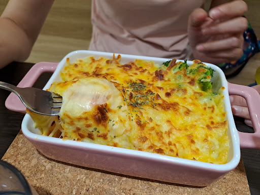 位於巷弄之間的長條型店面,門口可停機車,店內約24個座位,年輕老闆、老闆娘兩個人經營,今天點了一份焗烤義大利麵和燉飯,搭配A,B套餐,出餐速度我覺得算快,口味也很不錯,如同其他網友說的,麵條偏硬一點點的,但口感不錯,焗烤牽絲度強烈,燉飯不是超級軟爛那種,搭配套餐的薯條也、柳橙汁也很棒,而且店內超級多公仔,小朋友很喜歡,真的值得推薦給大家去試試看!