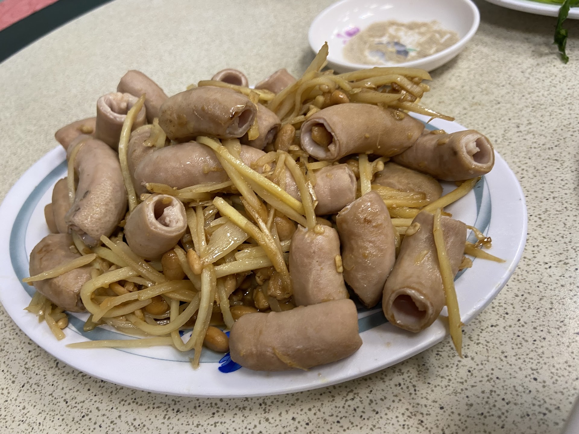 Read more✅過年期間第一次來訪,除了過年桌菜也能單點熱炒,環境看起來頗有歷史,有點可惜餐桌上有傳統桌巾味道有點重,但看起來是乾淨,餐具也乾淨沒有殘渣和殘留的水,算是還能接受的範圍。 ✅薑絲小腸有驚艷,大約兩個指節大,內裏也清理乾淨沒有太多肥油,味道是標準客家味,有鳳梨豆瓣醬的甘甜,稍微強的酸感,吃起來也不會像橡皮筋咬不爛,榮登今日最愛。 ✅蚵仔酥外皮看似有點厚,吃起來有爆漿感,外衣酥脆,不會過於油膩。 ✅酥炸肥腸外皮有酥脆,是大腸頭的部分有誠意,比較厚的部分油脂稍微多一點,吃到後來會有點小膩。 ✅酥炸中卷,外衣稍微厚一些,夠酥脆微油膩。 ✅苦瓜鹹蛋,裡面蔥味有點濃🤣但比起其他熱炒店來說算是沒什麼勾芡版,吃起來比較清爽。 ✅蔥爆牛肉,肉有微微厚實感,火候掌握的不錯有鍋氣,不會太老,也不會有太濃的沙茶味蓋掉一切,鍋氣很香必須配飯!! ✅過年期間生意還是很好,不論大桌年菜或是小組吃熱炒都人多多,至於大家說阿姨的態度不是很友善,當天遇到的都還算普普,沒有笑容但不至於臉太臭。 ✅今天都點小份,三人吃六道菜挺夠的,可惜地瓜葉上菜途中說賣完了,cp值很高願意再訪,今日小敗筆點太多...