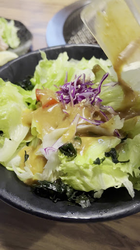 ⏺️其他共同餐點: 🔹沙拉:提供胡麻醬,份量、種類不算多 🔹海鮮:蠻新鮮的,蝦子、干貝、透抽是好吃的 🔹杏鮑菇:唯一可以烤的菜,可以吸雞湯載烤很特別