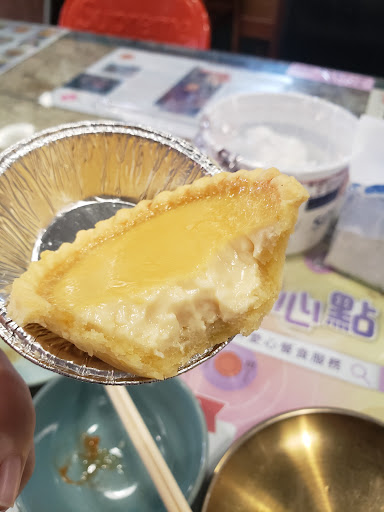 曲奇餅皮蛋撻 雖然係熱的,但係餅皮係淋(軟)。作為香港人,好明顯知道係用微波爐/蒸爐翻熱完,所以餅皮完全過濕軟化。沒吃過的台灣人可能以為本來蛋撻就是這樣?我可以話你知告訴你,不是這樣的。正常蛋撻餅皮應該係要脆,像曲奇餅結實而鬆化。而這個老闆賣35蚊台幣(大約9蚊港幣)就等同我在香港我媽街邊買4蚊港幣一個(大概14,15台幣)然後拿回家隔夜再翻熱的味道一樣。