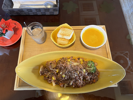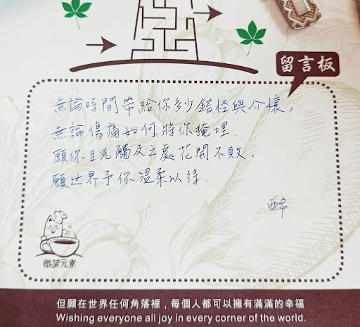 Read more一踏入店就能充分感受到老闆的熱情 小聊了一下,已經在中壢地區11個年頭 老闆非常有愛的擔任愛心志工 店內傍晚也有伴著孩子學習的陪讀班 店內陳設是老闆親繪的作品!一幅一幅很漂亮 餐點用心好吃😋 一定會再回訪 老闆還送了我一張明信片, 非常用心是自己的畫作加上鼓勵人的話語和聖經的詩詞,一整個很溫暖親切