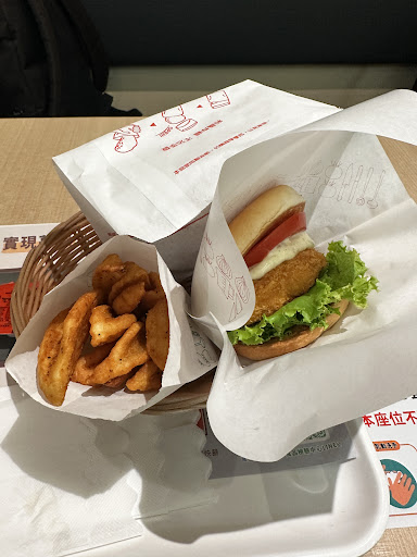 這次點了#番茄黃金蝦堡 套餐 $275 套餐的飲料是搭咖啡 可換成其它飲品 換成紅茶 可減$20 薯條的形狀蠻特別的 也很厚實 好吃 漢堡有大塊的番茄 來中和蝦片炸物的感覺 再搭配生菜有很清爽的感覺