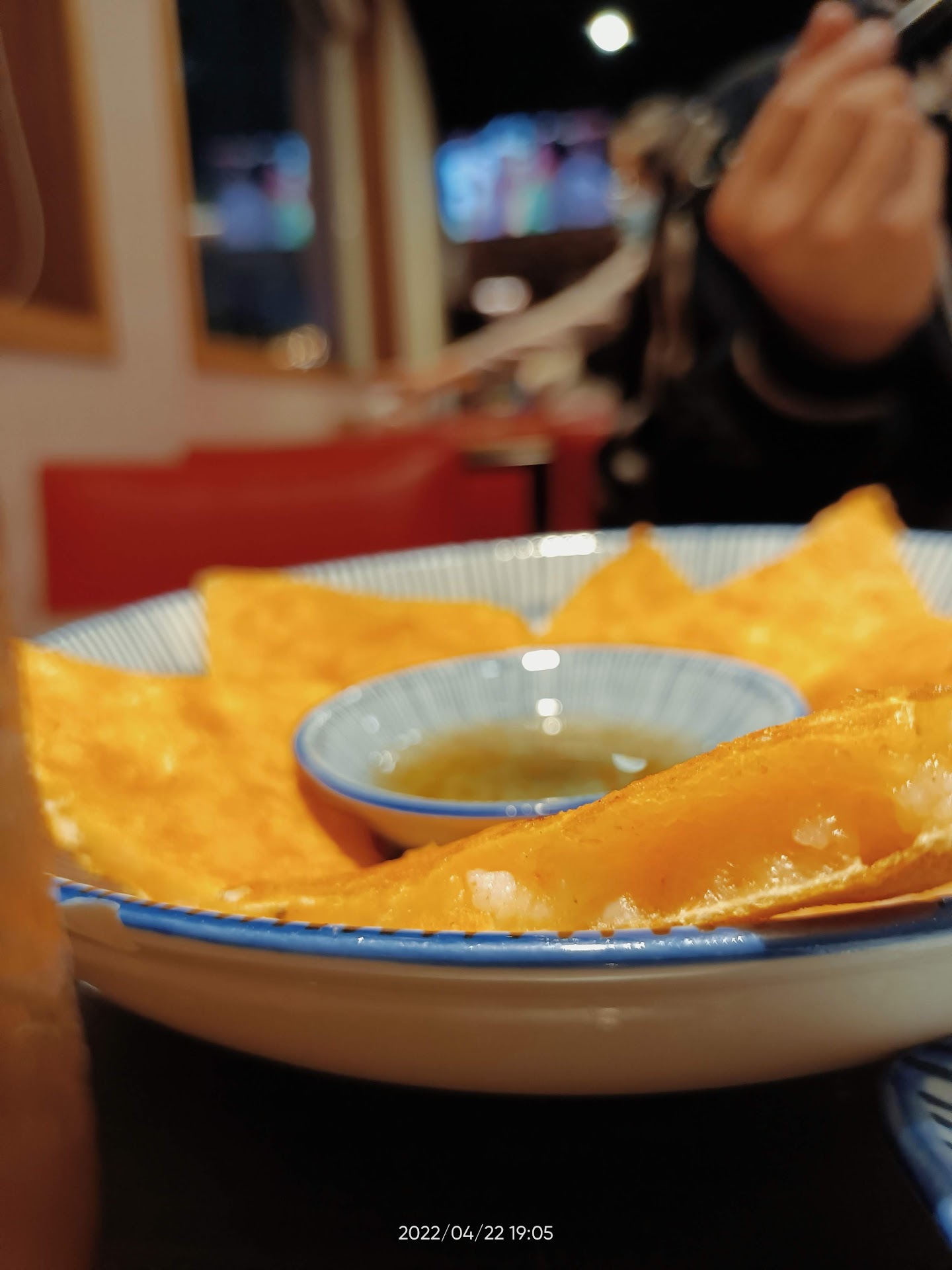 月亮蝦餅有一定的厚度,配的是果醋醬,剛上來的時候要趁熱熱的吃才會脆,配果醋的醬也別有一番風味❤️