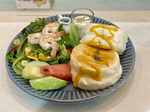 看到住處附近新開一家裝潢看起來頗溫馨的小店,評價也蠻高,趁著假日中午用餐,運氣不錯還有吧台位置可坐。 爬文得知店家招牌應該是舒芙蕾,想點鹹的但鮭魚賣完了,只好點鮮蝦的。餐點現做,候餐時間頗久,若沒有耐心的人不建議來。 送上時擺盤算漂亮,但覺得水果應該另外放,不要與舒芙蕾放一起。另有優格一小杯,上面灑了芝麻頗特別。 舒芙蕾吃起來空氣感非常重,濕濕的口感入口即化,以健康角度來說是很不錯,吃起來沒有負擔。但整體的份量實在偏少(生菜+5隻小蝦子…),我自認食量不大,吃完後感覺非常空虛沒有吃飽(沒有加價升級套餐)。沙拉裡面有個果乾蠻不錯的,芝麻葉味道也很香,除此之外對我而言應該會是一次店。畢竟以鹹口味的舒芙蕾價位要290元,我認為CP值偏低,而且還沒有附飲料;甜的口味價位在200元左右或許要嚐鮮可以考慮。
