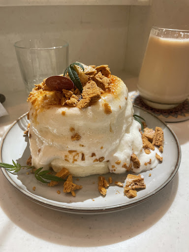 舒芙蕾的蛋白比很高,所以很蓬鬆,吃起來像棉花糖,朋友滿喜歡的,自己覺得還不錯,但還是喜歡吃偏麵包的紮實口感。