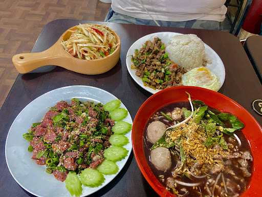 今天中午到店用餐共點了四道菜,牛肉河粉、打拋牛肉飯、涼拌生肉、涼拌木瓜四道都真的好吃,,之前就是在臉書看到老闆PO文就被🔥到了,因為沒有伴,一個人吃的有限,今天終於有機會嚐嚐了牛肉河粉加上調味四寶很👍,打拋牛真的是白飯小偷再加上一顆半熟🥚,送丹(涼拌木瓜)真的比一般外面賣的不一樣,之前買的都為了迎合國人口味嚐起來就少了泰式風味,至於涼拌生肉要點前有詢問老闆,後來闆娘說今天的肉很新鮮,想說平常敢吃生魚片就試試看吧,上桌看起來好美味,真的很新鮮沒有怪味,中途老闆跟老闆娘還會來詢問吃的習慣嗎?不習慣還可以再加熱變熟肉,後來吃剩一半就麻煩闆娘再幫忙加工一下又加點了香米飯一碗,剩下的送丹就打包今晚加菜了,下次還要再去試試其他菜色,對了泰式粉紅奶茶配上🐻瓶裝太口愛了,但是我想要喝奶綠,還要今天可惜了菜單上的烤雞屁股跟泰式冬粉香腸,因為備料不足的關係中午沒有,不然真想嚐嚐,重點是老闆跟老闆娘真的超客氣跟親切的,比起跟桃園後站一些有名泰料店好太...