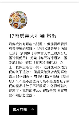 2天後8/5 卻收到店家用評分系統來信: 海鮮或許有可能出問題。 但能否看看我對天發誓的解釋。 蛤蜊《當天早上送貨吐沙》 多利魚《冷凍當天早上退冰分切置冷藏備用》 尤魚《昨天冷凍退冰,置冷藏1晚》 蝦仁《當天冷凍退冰》 以上,我保證所言不假。 或許您可以很方便的按下退款。 但當天確實店內海鮮也賣出15份附近。 有1則回報不新鮮《就是您》^_^ 是不是也有可能不是因為吃了我們的產品才肚子不舒服呢? 您很輕鬆的退款了,我們却被uber寄報告信 着實有點不知該怎麼說。