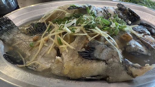 海洋中的精靈:石斑蒸魚 石斑魚的清蒸工藝簡單卻極為講究,魚肉白嫩柔滑,新鮮之極,搭配些許薑絲與醬油提味,既突出了魚的鮮甜,又不蓋過它的細膩口感。每一口都像是在捕捉大海的精華,讓人滿足得無以復加。