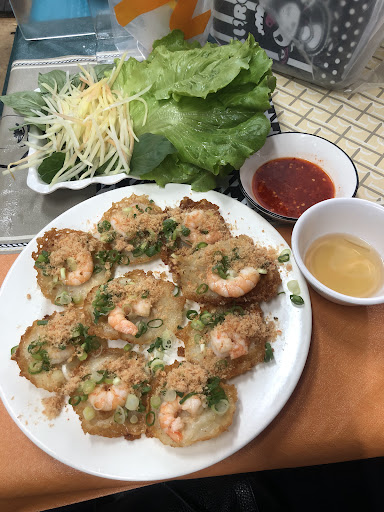 Read more看網路介紹一直很想來吃吃看.排隊內用的人真的很多.排隊其實不會很久.想嚐鮮的跟著排就是了!一份有8顆.外加一盤生菜.一份120元.生菜盤裡有大陸妹.青木瓜絲.九層塔.餐桌上有魚露(很大壺那壺)生辣椒.手扒雞手套跟筷子.還有沾醬碟.這次是兩個人用餐.排隊時看8顆感覺兩個人吃好像也還好.結果點了兩份.沒想到配著生菜吃真的會覺得飽.吃不完的只好打包.想打包告知店員.他會給你餐盒跟兩個袋子.還有包好的魚露醬跟生辣椒(要自行打包喔!)袋子一個讓你裝生菜.一個提袋.很周到.只是當我還在打包時.一個沒注意.店員已經在收桌子.沒問過我便把我還沒喝完的飲料也一起收走😅 推薦他們家的生辣椒.喜歡吃辣的一定要加.跟魚露加在一起真的很過癮.有辣度.魚露不會很鹹.蝦餅是外圍酥.裡圈是軟的.蝦子也新鮮.蝦餅上會灑蝦鬆跟蔥花.跟生菜包一起沾醬確實很特別也好吃.不會油膩.有單吃蝦餅試試口味覺得還是包上生菜最好吃.還是建議能現場吃最好.打包回去蝦餅會變軟.但也是好吃啦! 如果想在夜市還要吃其他小吃建議不要點太多份喔!因為包著生菜吃真的會...