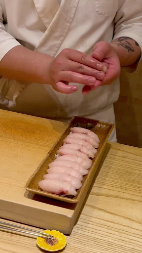 螢光烏賊,配上醋味增醬 2-5月春季限定 烏賊處理過後,整體軟綿,可以嗅到烏賊的香氣,應該是海的味道,烏賊肚子裡有點東西,入口口感根本是品嚐大海的香氣 可以吸一下肚子裡的東西,品嚐海味