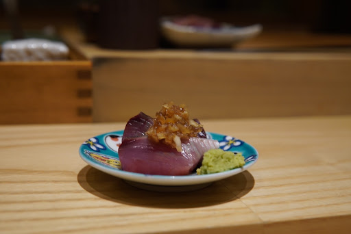 鰤魚握壽司,搭配柚子胡椒醬 柚子的香氣很足,入口後柚子香氣很強勁,搭配魚肉的口感炙燒的香氣,鮮甜多汁,入口可以感覺魚肉綿密