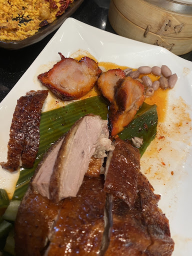 燒臘雙拼-鵝+叉燒,這道菜先說叉燒,切的太厚且筋根本咬不斷,以我的樣子一口塞都太大,且沒有燒臘醬只附甜沾醬,刀工完全不行,失去品嚐叉燒肉的口感沒沾醬扣分,燒鵝,一樣切的太大塊了,且烤的有點老,皮已經不脆應該是回鍋再製,筋膜咬不斷,這需要牙口強壯的才能點,吃了半天,她倆一直說是烤鴨,就知道他沒有把燒鵝的香甜烤出來,且多了個鴨子的腥味,扣分 這張有多樣菜餚 避風塘軟殼蟹,少了炸香蒜片,且炸蟹與豆片酥蛋酥分不出,表示掌鍋的懶,兩樣食材是一起弄的,炸蟹也不夠酥香軟嫩口感是軟爛,炸功完全不行 珍珠丸子,這道是台灣特有的僞港點,就一般般沒啥特色,肉丸子外面裹著米,丸子的內陷算是Q彈,米蒸的也恰到好處 粉蒸排骨,都是骨頭的粉蒸排骨,這用生排骨稍微抓醃一下,裹上粉蒸粉調味,排骨基本上用的部位不對,都是碎骨頭,吃起來口感極差,且蒸的不夠粉嫩,沒有用豆鼓提味且沒有先滷過,用的也不是一根根的排骨,光啃骨頭就失去價值了! 鮮蝦燒賣,蝦嘛!沒啥蝦味,就只有奇怪的脆感,燒賣就不行了,燒賣內餡肉泥打過頭粉肉比不對,內陷都有種吃貢丸的口感了,皮就一般般,沒啥印象就是不香Q彈