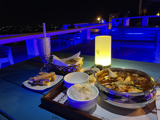 說完了餐點,最後來說一下景色吧。風景真的:巨。美。的!!! 雖然說風景每一家應該都差不多,不過可能要看他們前方的樹木與角度吧。藍天白雲的山景、搭配著夕陽落下的色彩與底下城市的微弱燈光,真的以為來到了國外。白圍牆外面座位也是使用藍白色系的設計,會有種讓我以為去到了某個歐洲渡假村的感覺XD,這也算是一種偽出國吧。太陽下山後,從山上往市景看去,是完全不一樣的感受,真的好美!...