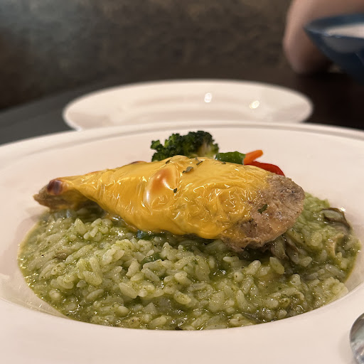 -青醬雞肉飯 $260 雞肉本身沒啥異味,肉質也不乾柴~特別的是上面有鋪起司,鹹香的滋味有加分。燉飯的米應是一般台灣米,米心也沒有比較硬,搭配青醬及一些菌菇,還算好吃但吃到後來有點偏鹹🍚