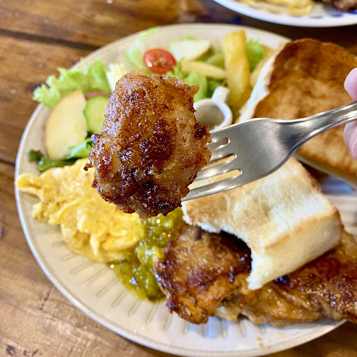 🍗迷迭香雞腿排早午餐(280) 早午餐皆有附炒蛋、沙拉、地瓜薯及厚片 炒蛋是屬於類似歐姆炒蛋的口感滿濕潤的 沙拉青菜算新鮮搭配胡麻醬 地瓜薯條我覺得炸得剛好不會太乾 厚片有奶香又烤得很酥,友人覺得稍乾 重點雞腿排雞皮有煎到酥脆 調味也不會過鹹,雞腿肉也很嫩!
