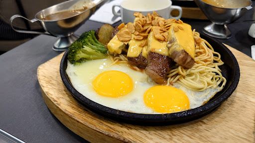 Great value Taiwanese style steak. You have a choice between beef, chicken, pork, and fish. Each main dish has a choice of macaroni, spaghetti, grilled onion. They also offer black pepper sauce or mushroom sauce or both. There's all you can eat style drinks, ice-cream and soup. This place offers awesome value and the restaurant is very new. There isn't much they need to improve upon. Definitely recommend...