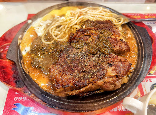 Typical Taiwanese Steak that is served with spaghetti and vegetable. Self-servuce counter with owner special black pepper sauce. Standard condiments such as pepper, ketchup, BBQ sauce also available. Freeflow soup, popcorn, softdrinks, coffee...