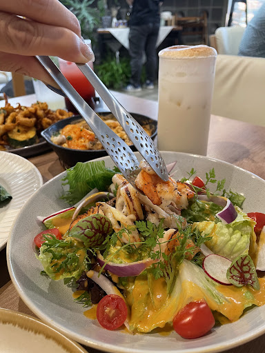 🔸酥炸本港透抽 $280 新鮮Q彈的酥炸透抽再搭配上檸檬和沾醬 吃起來很清爽,完全不會因為是炸物而覺得油膩 🔸 泰式海鮮沙拉 $360 店家特製的泰式醬料加上豐富的蔬菜和海鮮 看起來很繽紛,吃起來很清爽,非常開胃 夏天超適合🥰 🔸海鮮蛋煎 $300 超級浮誇~~ 裡面有滿滿的海鮮,蝦子🦐、透抽、鮮蚵、魚片...超級豐富,尤其是鮮蚵有夠肥美🤤 🔸主廚私房-獵人燉雞 $520 主廚的私房菜-獵人燉雞 雞肉烹調的恰到好處,非常多汁 搭配下面的紅醬超級好吃!! 很推薦大家來一定要點點看主廚私房菜👍 🔸慢燉牛頰肉 $640 牛肉燉到入口即化,一放進嘴裡就會馬上化開 旁邊的馬鈴薯泥~超級好吃😋 口感很綿密、還有淡淡奶香味 🔸 蜜桃野莓氣泡飲 $150 🔸 冰檸檬薄荷氣泡飲 $120 氣泡飲都很清爽解膩 🔸黑糖鮮奶茶...