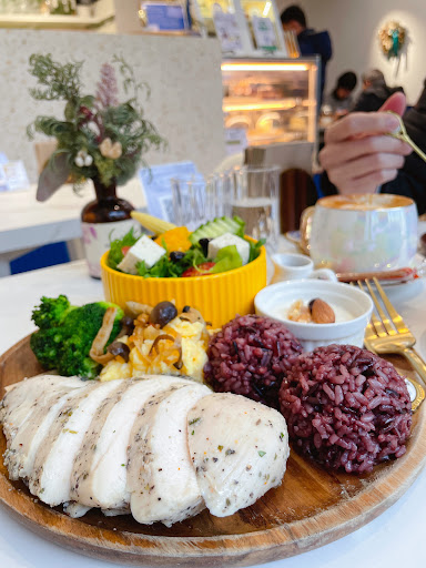 #桃園 #藝文特區 附近的小巷弄裡,可以發現許多有質感的餐廳&#咖啡廳 ☕️,只要是人潮洶湧的,想必便是網紅少女們的必爭之地。隨意走走經過這間,氣氛感覺還不錯便被吸引進來。 [💪增肌減脂2.0]的蛋白質含量真的很高呀!除了有一大份嫩煮香料雞胸肉🐔,還有鮮菇滑嫩炒蛋,連蔬食沙拉盅裡也放了幾塊豆腐,另外附上點綴些許🌰堅果的希臘優格,保留食材的原味不過份調味,健康滿分! [🌽主廚特餐濃湯]是連小朋友都愛的玉米濃湯,可以吃到一顆顆的玉米粒。因為怕份量太多吃不完,另外單點的[🥚滑嫩炒蛋]& [🥓培根德腸]口味也都很不錯,跟一般早餐店相比高了一個等級。 ———💸——— ◽️增肌減脂2.0 $450 ◽️附餐 - 焦糖海鹽拿鐵(熱)+主廚特餐濃湯 ◽️滑嫩炒蛋 $40 ◽️培根德腸 $80 [☕️焦糖海鹽拿鐵]是加糖拿鐵中我最愛喝的口味,軟呼呼的奶泡上頭淋上網格狀的焦糖醬,入口時,海鹽的鹹味以及咖啡的苦味巧妙中和了焦糖帶來的甜膩,捧著圓滾滾的杯身手心傳來陣陣溫暖,不由自主都愜意起來~❤️