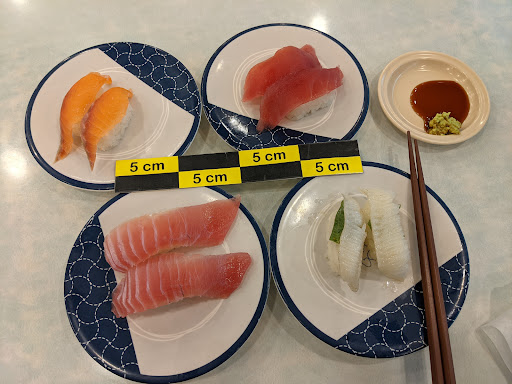 我們先點了四盤壽司,每盤單價40元,比較的基準是附近有(爭鮮壽司每盤30元),在飯量的部分都是機器揉製出來,但是大小比爭鮮壽司更小(有排除上方配料的視覺影響),準備比例尺可以大約得到生魚片的厚度均在≤0.4cm以內,部分食材薄度切到更薄。大切鮪魚腹壽司品質讓人感到失望,照片當中夾起來肉直接散開,新鮮的狀態會是這樣嗎?