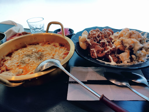 第一次吃和朋友去 建議大家最近天氣很熱 中午可能會比較辛苦 因為生意很好 所以室內有點熱 (有種在室內還中暑的感覺 並且所有食物都很熱 或者可能辣的情況 其實很沒胃口)不確定是不是關火和客人減少 就會發現是有開冷氣 但是前面用餐真的感受不到 當天點餐 很意外雙拼這個選項 說就是兩個小份價格 卻還需加20?意義不明(我個人以為雙拼的定義是小份價格加20 等於小份量幫你做兩個口味 但是這裡好像不是) 另外沒有明細都是老闆自己手記 結果上菜發現奶油年糕變成辣炒年糕 尷尬就是我們不吃辣 幾乎全打包回家 難怪結帳那時候就覺得好貴(雙拼算法和辣炒年糕部分) 本來是和朋友餐費均分 我都不好意思分了 幾乎變成請朋友吃 餐點都很好吃 老闆也很外向禮貌 但是整體用餐體驗其實沒有很高 帶朋友來 很明顯感覺朋友很失望