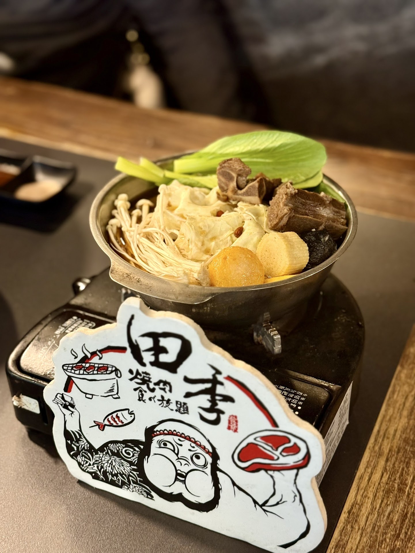 【桌面】 田季是火烤兩吃,小朋友才作選擇我全部都要!! 且這樣家人一起吃飯選擇也比較多。 火鍋有昆布.泡菜.番茄,三種選擇, 我偷偷告訴大家可以加入他們麻辣烤肉沾醬就變麻辣鍋了!! 調味料選擇也非常多,同一個食材搭配不同調味料有不同體驗。
