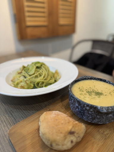 Read more環境 光線適中,座位寬敞,整體感覺非常舒適 前菜 餐包:有點像是歐式麵包但口感非常鬆軟,有點堅果點綴,非常符合個人胃口 玉米濃湯:口感是偏濃稠的,但喝起來不會有很重的麵粉感,玉米已經打碎,洋蔥丁還保留口感,還有培根提味,可以感覺到店家是非常用心的 主菜 青醬雞肉義大利麵:麵條軟硬度適中(個人喜歡軟一點的口感),青醬口味也非常棒,質地偏濃稠,每一口麵上都可以扒滿醬汁,雞胸肉的話就是正常好吃的雞胸肉,對了還有幾片青菜跟杏鮑菇非常健康👍 蒜辣蛤蜊義大利麵:麵條表現相同,醬汁因為蛤蜊蒜頭辣椒口味非常豐富,但個人覺得蒜頭味偏淡;辣度的話個人覺得幾乎沒有辣,不過有蛤蠣滿滿的鮮味,蒜頭炒過也還保留口感蒜味非常濃郁,同樣有幾片蔬菜跟杏鮑菇,整體而言非常好吃 總結:個人覺得不管是食物品質或價錢,CP值都非...