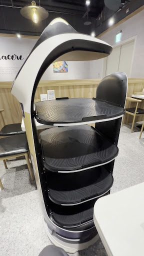 環境: 餐桌面積大 上了四人的餐點覺得不會很擠沒位子 桌距也蠻寬的 不會和別桌客人離太近 環境打掃的很乾淨 有一台貓咪機器人幫忙送餐很有趣
